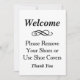 O sinal de cartão de boas-vindas para exibição durante as apresentações em casa apresenta um design personalizado preto e branco clássico: "Bem-vindo, remova seus calçados ou use cobrir de calçado". Personalize o texto personalizado para se adequar à sua ocasião.
