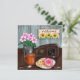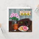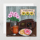 Placa de vazio. Faça-o pensar em você, aniversário, saudades de você ou cartões de agradecimentos! Arte digital. A mão desenhou a cena da safra com um sinal de girassol de boas-vindas, um vaso de flores cor-de-rosa uma xícara de café quente e duas rosquinhas com um rádio vintage ao fundo.