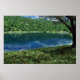 Um lugar tranquilo para descansar, debaixo de uma árvore no banco de pastagem de um lago azul profundo, olhando para as reflexões de nuvens e árvores na água ondulante. Uma cena 3D criada em Vue.