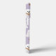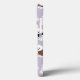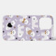 Cão-de-bichão-gato frita em suéteres e arcos com ossos de cão espalhados e estampas de pata em fundo roxo claro.