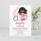 O convite para o aniversário desta garota mostra uma linda garota negra com sua bicicleta rosa. Em um fundo de sotaque giro cor-de-rosa e branco com pontos e garota atrás.