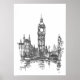 Um esboço original preto e branco do Big Ben London pelo artista inglês Terry Donnelly mostrando o rio Tamisa e a Ponte de Londres