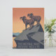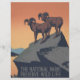 Poster de Vintage wildlife com Mountain Goats / Bighorn Sheep for National Park Service - Este é um vintage wildlife poster é do National Park Service dos EUA mostrando ovelhas selvagens de bighorn em rochas. A poster é muito gráfica, criada entre 1936 e 1939, publicada pelo Projeto de Arte Federal Administração do Progresso das Obras (WPA). A bela poster é feita em laranja e preto, com montanhas azuis e um lago ao fundo. O poster de carneiro/cabra de montanha promove viagem para parques nacionais. Esta bela poster de vida selvagem parece excelente em nossos presentes!