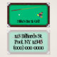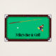 Este cartão de visita apresenta uma mesa de piscina, com um pente de piscina, uma bola de ponta e bolas de piscina. A imagem é repetida no verso, com duas imagens transparentes no topo. Todo o texto é completamente personalizável.