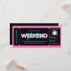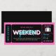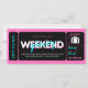 Bilhete de Presente de Dom do Fim de Semana Preto Cor-de-Rosa. Um design divertido e colorido com um cartão de embarque preto da velha escola com uma mala branca e tipografia ousada em fundo rosa-quente. Os sotaques azuis brilhantes e o flamingo semitransparente dão ao vale uma sensação tropical. Este vale-presente é o presente perfeito para uma viagem de fim de semana com seu namorada, parceiro, bestie, esposa, mãe, avó, etc. Basta adicionar o destino, a data e quaisquer outras especificações para a viagem e você está pronto.