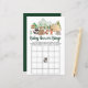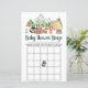 Bingo de chá de fraldas rupto, bonito, com ilustração de animais florestais (urso, raposa e guaxinim) com sua tenda e acampamento nas montanhas e na floresta e "Bingo Chá de fraldas" em um roteiro verde de caçador escuro.