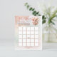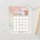 Design do jogo "Bingo" de Chá de fraldas bonito apresentando um ursinho de pelúcia com uma gravata de arco rosa em uma cesta amarrada a um monte de balões cor-de-rosa e leves enfeitados com flores cor-de-rosa. Um fundo de aquarela cor-de-rosa-rosa e branco-claro com esmaecimento branco ao redor do design. A parte traseira apresenta uma repetição do mesmo plano de fundo com bolinhas cor-de-rosa de dois tons. Disponível em opções de impressão e/ou download. Design composto por Designs Holiday Hearts.