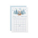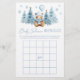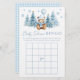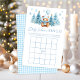 Um jogo clássico sofisticado de "Bingo" desenhado para um chá de bebê, adorado com um encantador ursinho vestindo chapéu azul e cachecol, segurando um balão azul, cercado por pinheiros de inverno e flocos de neve e padrões de gingham azul bebê nas costas. Envolva seus hóspedes com este jogo delicioso, perfeito para adicionar diversão e entusiasmo às suas comemorações de inverno enquanto cria memórias queridas.