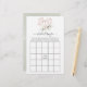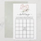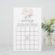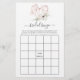 Cartão de jogo de bingo de chá de noiva com flores de anemona e folhas de eucalipto em um coração geométrico em rosa dourado.