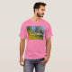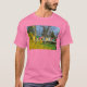 Esta camiseta mostra uma fileira de casas de pássaros coloridas caindo no sol da primavera. Um arbusto amarelo da forítica, árvores, céu azul e grama verde enquadram a fileira de casernas únicas.