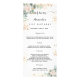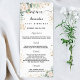 Cartão de menu de festa de aniversário. Personalize e adicione um nome, idade, data e menu. Um fundo branco-quic, decorado com poeira brilhante de ouro falso, florais brancos e verde de eucalipto. Letras pretas coloridas.