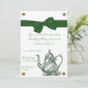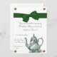 Um belo convite para uma festa de chá ou festa de aniversário de uma senhora. Apresenta uma imagem vintage de um pote de chá verde na parte inferior e um gráfico de uma fita e arco verdes na parte superior. Gráficos de pernos de ouro apontam os cantos. Muito elegante!