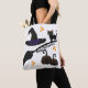 Saco branco de tote para o Dia das Bruxas com design de gato preto divertido. Adicione o nome da criança com o texto "quer doce" Um gato preto com olhos verdes decora ambos os lados da bolsa. Uma vassoura-bruxa e chapéu, juntamente com abóboras e milho doce, decoram a frente. O texto angloriado diz: "Feliz Dia das Bruxas".