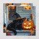 Um cartão de Dia das Bruxas que você pode personalizar a mensagem. Uma bela ilustração ai de um gato negro descansando na varanda da frente com um chapéu de bruxa, ao lado de um jack-o-lanterno no Halloween esperando por truque ou tratadores.