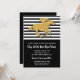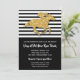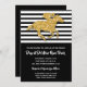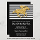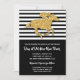 Um dia nas corridas de cavalos, um falso cavalo de corrida dourado em listras negras e brancas no topo e na área preta no fundo com seus detalhes de evento em letra chic. Todas as fontes, texto, cores de texto, tamanhos podem ser modificados, basta clicar no botão PERSONALIZAR e personalizar o link adicional. Ventiladores, pratos, guardanapos, rótulos de garrafas de vinho, fãs de mão e mais disponíveis em nossa loja.