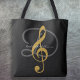 Grande saco preto de tote personalizado com seu nome e inicial, e com uma nota musical de ouro falsa gráfica (clave de triplo)