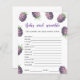 Cartão de convite para chás de fraldas em forma de grão com ilustração aquosa das amoras. O texto diz "um bebê doce de fruta está a caminho." Itens correspondentes disponíveis. Respostas: CRAVINGS, CRYING, PACIFIER, FRASCO, LUZ NOTURNA, LULLABY, STROLLER, EPIDURAL, BURP, ALTA CADEIRA, SACO DE FRALDA, SWADDLE