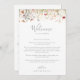 Esta bela carta de boas-vindas do casamento de Bodho Wildflower é perfeita para um casamento rústico. A design apresenta flores cor-de-rosa, roxa, esbranquiçada, amarela, azul empoeirado, vermelha, silvestre burgundy montadas em um padrão floral perfeito e delicioso, evocando beleza natural. Personalize a frente com uma mensagem de boas-vindas para seus convidados e seus nomes. Personalize as costas com a programação de eventos e outras informações úteis.