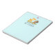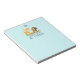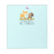 Um bloco de anotações personalizado com uma ilustração fofinha apresentando um veado bebê e um pequeno esquilo segurando uma bolota e uma borboleta voando sobre suas cabeças. Estas adoráveis criaturas de floresta em pé sobre uma grama com alguns cogumelos brancos perto de seus pés. Fundo azul claro.