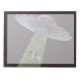 Um lápis a cores de uma vaca infeliz sendo raptada por aliens em um disco voador em uma noite escura e estrelada. A manada assustada se abraça ao fundo.