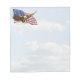 Pasta de notas de 5,5" x 6" com a imagem de uma bandeira americana que se acenava e de uma águia careca em voo contra um céu azul nublado e lavado. Veja toda a coleção de Bloco de Notas Patriótico dos anos 40 nos TOUCHES ESPECIAIS | Seção Favoritos para festas.