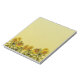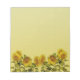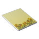 Bloco de notas com borda inferior de girassóis amarelos brilhantes sobre fundo texturizado.