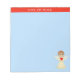 Anjo pequeno fofo segurando um coração em um bloco de notas de fundo azul claro. O texto pode ser personalizado.
