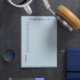 Planeamento diário com horário das 7:00 às 19:00 e uma caixa para juntar notas em um design azul minimalista. Bloco de notas do planejador diário personalizado com seu nome em letras negrito. Notebook de planejamento diário limpo em azul e azul profundo.