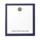 Um bloco de notas profissional com um design de luxo minimalista em azul e branco marinho. Emblema metálico de ouro escovado no topo com o nome do monograma em tipografia clássica em um simples fundo branco, emoldurado por uma borda de marinho.