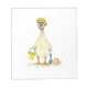 Ganso de bebê bonito com balde de areia e chapéu em férias construindo castelo de areia