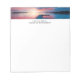 Bloco de notas com uma fotografia maravilhosa. Um lugar cênico. Um lago tranquilo com uma doca de madeira que se estende para fora. Definir o sol fornece lindas cores no céu, vermelho e azul vibrantes.