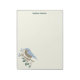 Crie um doce presente personalizado. Este papel de carta apresenta uma simples ilustração de um pássaro azul empoleirado em um galho com algumas amoras azuis contra um fundo creme colorido. O gráfico está em azul claro, marrom claro e verde escuro. Há um ponto na parte superior do bloco de notas para adicionar um nome em caracteres verdes de script.