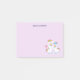 Posto-ele anota com 2 unicórnios dançantes bonitos com caudas brilhantes e coloridas, e mano. Um arco-íris colorido com nuvens em cada lado acima de suas cabeças. Outros elementos incluem uma pequena flor, um coração e algumas estrelas. Fundo roxo claro.