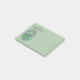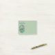 O texto personalizado figura neste bloco de notas de posto embelezado com trabalho de arte pastel, que representa três trevas ou lamelas em verde macio sobre fundo roxo mudo.