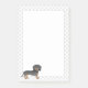 A ilustração original do desenho de Destei de um lindo cão da raça Dachshund, preto e casaco bronzeado, de cabelo curto. O meio é branco, enquanto as bordas têm um padrão de estampas de pata de cinza.