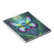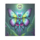 Esta imagem é uma bela cena balística, com duas grandes borboletas etéreas com asas vibrantes e detalhadas em tons de azul, roxo, rosa e amarelo, acentuadas com pequenos pontos brilhantes. As borboletas pairam no centro da imagem, iluminadas por uma lua de cheio brilhando suavemente ao fundo, criando uma atmosfera mágica noturna. Ao redor das borboletas, há uma quantidade exuberante de flores coloridas em flores de cheio, incluindo flores roxas e brancas, junto com algumas flores amarelas menores. As flores são aninhadas num vaso com um intrincado design, que se senta sobre um pedaço de grama banhado à luz da lua. A cena é enquadrada por estruturas curvas, em forma de árvore, acrescentando uma sensação de profundidade e cercado. Pequenos detalhes, como uma borboleta minúscula no canto superior esquerdo e algumas folhas e pétalas espalhadas ao redor, somam ao encanto e à servidão ambiente desse fantástico jardim noturno.