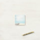 Notas pegajosas com uma bela imagem rústica. Cores sutis de azul claro, marrom arenoso e branco suave. Uma cena de praia com um barco na praia com uma rede de pesca pendurada ao lado. Um olhar elegante.