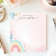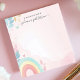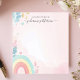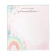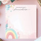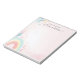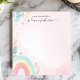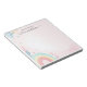 Adicione um toque de fantasia e charme aos seus bilhetes com este bloco de notas personalizado. Um arco de arco-íris pastel suave, acompanhado por corações delicados e folhagens, decora o canto inferior esquerdo. O design leve e arejado cria uma sensação alegre e edificante. Personalize este bloco de notas com seu próprio texto. Perfeito para notas diárias, listas de tarefas ou compartilhar uma mensagem doce.
