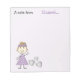 Personalize este bloco de notas para uma menina, com o nome dela. Projetado em lilás com uma pequena figura loira de pau, vestida de bolinhas roxas, com alguns corações amorosos.