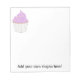O cupcake estilo cartoon com glacé lilac neste bloco de notas pode ser personalizado com a sua marca de negócios ou detalhes pessoais. Um doce bolo em um estojo de papel com aspersas de açúcar - faça dele seu!
