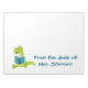 Notas de dinossauros personalizadas e bonitas para professores e bibliotecários do ensino fundamental. Apresentando um dinossauro verde com óculos vermelhos lendo um livro azul. Adicione seu nome. Você pode alterar o estilo/texto/cores da fonte usando o botão EDIT.