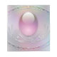 Um design azul pastel, lavanda e rosa, com um ovo rosa translúcido em uma posição de filigrana prateada, circulado por uma estrutura oval prateada leve, com quatro gemas mais lisas, como ovos coloridos.