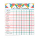 Este placar colorido para um jogo dominó tem espaços para até oito jogadores. No topo está uma imagem colorida de dominós em azul-claro, azul, amarelo e azul-céu. As linhas da grade são azul-turquesa e rosa-claro. Eu também tenho um placar para jogadores de cartas na minha coleção, "Escreva-o para Baixo"