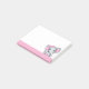 Notas pegajosas com uma ilustração de aquarela de elefante rosa e fofinha. Ela tem orelhas bonitinhas, cor-de-rosa e bolinhas branca e arco bonito de fita rosa sobre a cabeça. Borda inferior é um padrão de rosa claro com bolinhas coloridas creme.