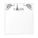 Dê aos seus favoritos para festas de cancan um sotaque francês com este bloco de notas branco de 5,5" x 6" que apresenta a Torre Eiffel. Feito à mão com a inscrição parisiense preta chic e o pergaminho decorativo detalhando. Veja toda a coleção do Bloco de Notas de Cancan em TOUCHES ESPECIAIS | Seção Favoritos para festas.