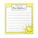 Torne as notas de sala de aula ou de escola divertidas com este Sorriso Brilhante e Brilhante Face Personalizado de 5,5" x 6" do Professor Notepad do Zazzle! 40 páginas rasgadas do lado do solteiro, papel certificado FSC, suporte para duro de cartão. Vendido pela pastilha ou em quantidades iguais ou superiores a 2. Personalize facilmente o nome do professor e o tipo de nota para atender às suas necessidades de presentes. Perfeito para doar sozinho ou adicionar a um jardim de infância ou a um professor de ensino fundamental a valorização do cesto de presentes.