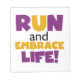 Se você gosta de correr, correr 5Ks, 10Ks, meia maratona, ou maratonas, você vai adorar este design de texto colorido em roxo e amarelo que lê Run and Embrace Life! Corra e Abraça Camisas de Vida, capuzes, ímãs, botões, cartões, adesivos, correntes-chave e muitos outros itens para corredores que adoram um design brilhante e colorido!