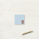Um desenho animado adorável, fofo, feliz de um ursinho de pelúcia castanho, ele tem um sorriso e bochechas rosadas e uma mancha azul e branca com padrão de cheque na barriga. O fundo é azul com um padrão de grade branco.