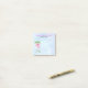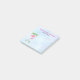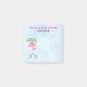 Notas pegajosas de chá de fraldas com uma ilustração de um flamingo cor-de-rosa mãozinho e bebê parado num leito de flores florais suculentas com palmeiras verdes balançando nas costas. Tropical e bonito. O fundo é uma aquarela azul-claro de verão com pistas de púrpura.