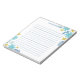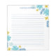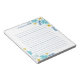 Bloco de notas floral com flores e folhas em azul, amarelo e turquesa. O bloco de notas está alinhado. Adicione seu nome em azul.